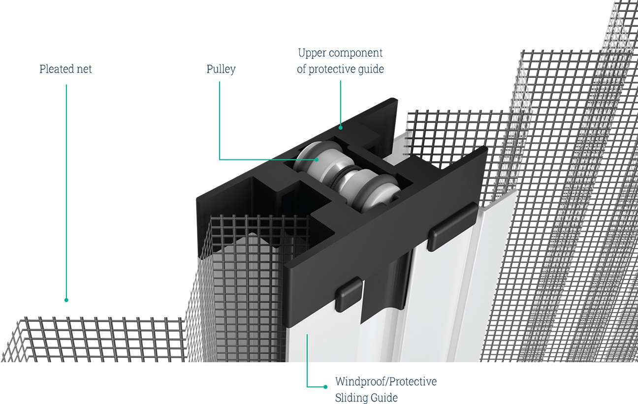 Zaštitna klizna vodilica otporna na vjetar štiti plisiranu mrežu od vjetra, za širine veće od 1,40 m i manje od 5 m.